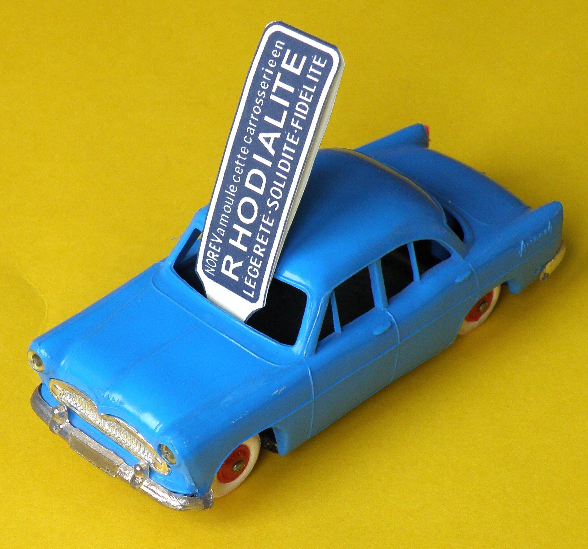 Une étiquette Rhodialite bleue à trou (véhicule miniature non fourni)